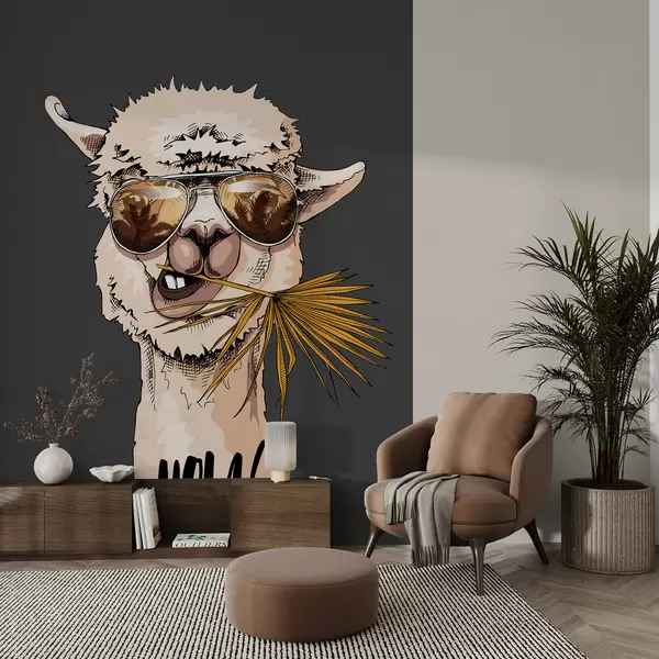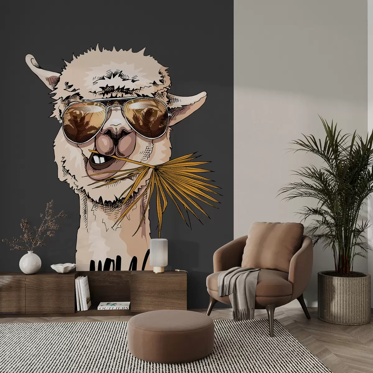 Carta da parati Ritratto di un lama che indossa occhiali da sole con un ventaglio di foglie di palma nr. u98177v1