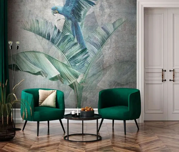 Carta da parati Grande pappagallo blu sul banano con struttura concreta del grunge nr. u95432