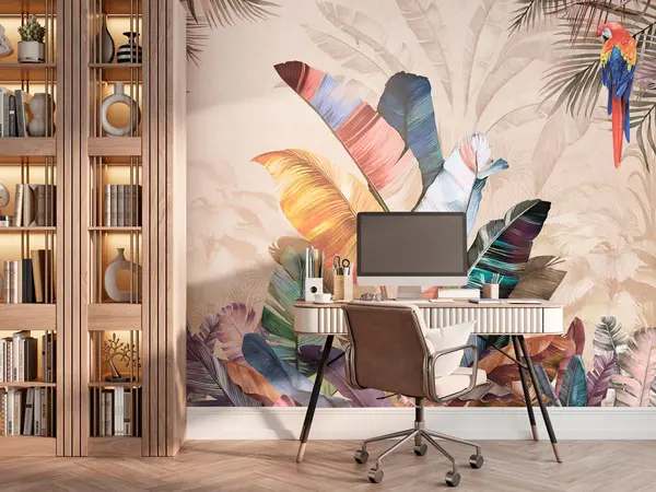 Carta da parati Foglie di palma colorate con uccello pappagallo tropicale nr. u95050