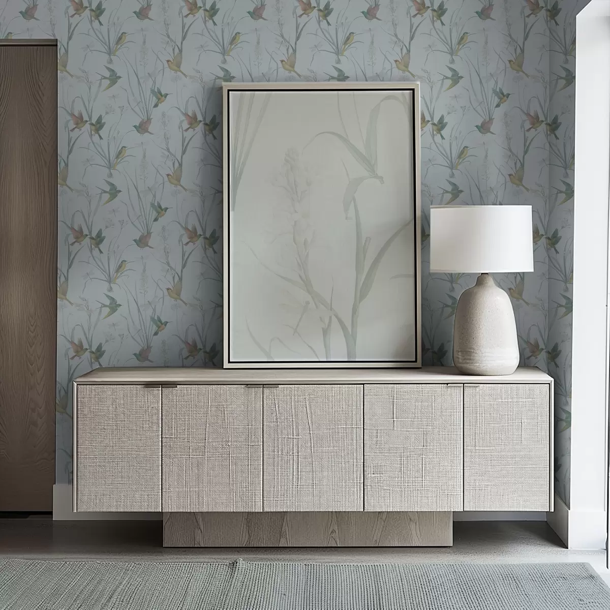 Carta da parati Uccelli tra l'erba dei prati su un terreno grigio-blu Nr. a00776