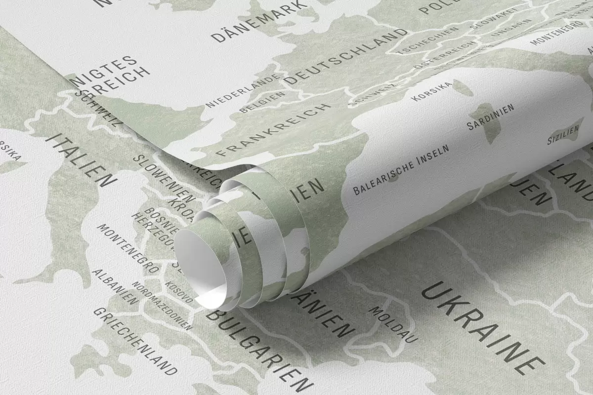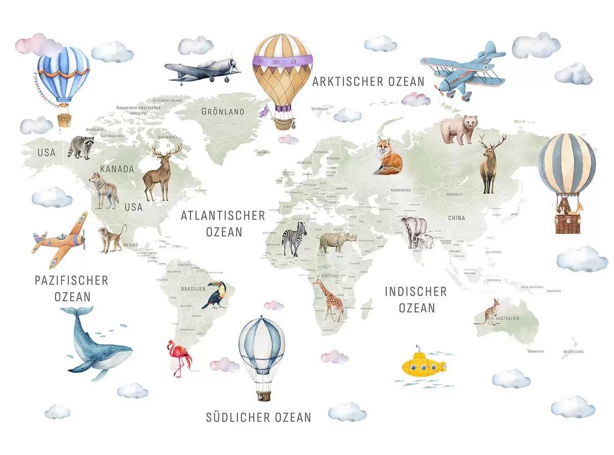Carta da parati Mappa per bambini in stile acquerello con animali e mongolfiere. Lingua tedesca. Colore verde. nr. c00001de