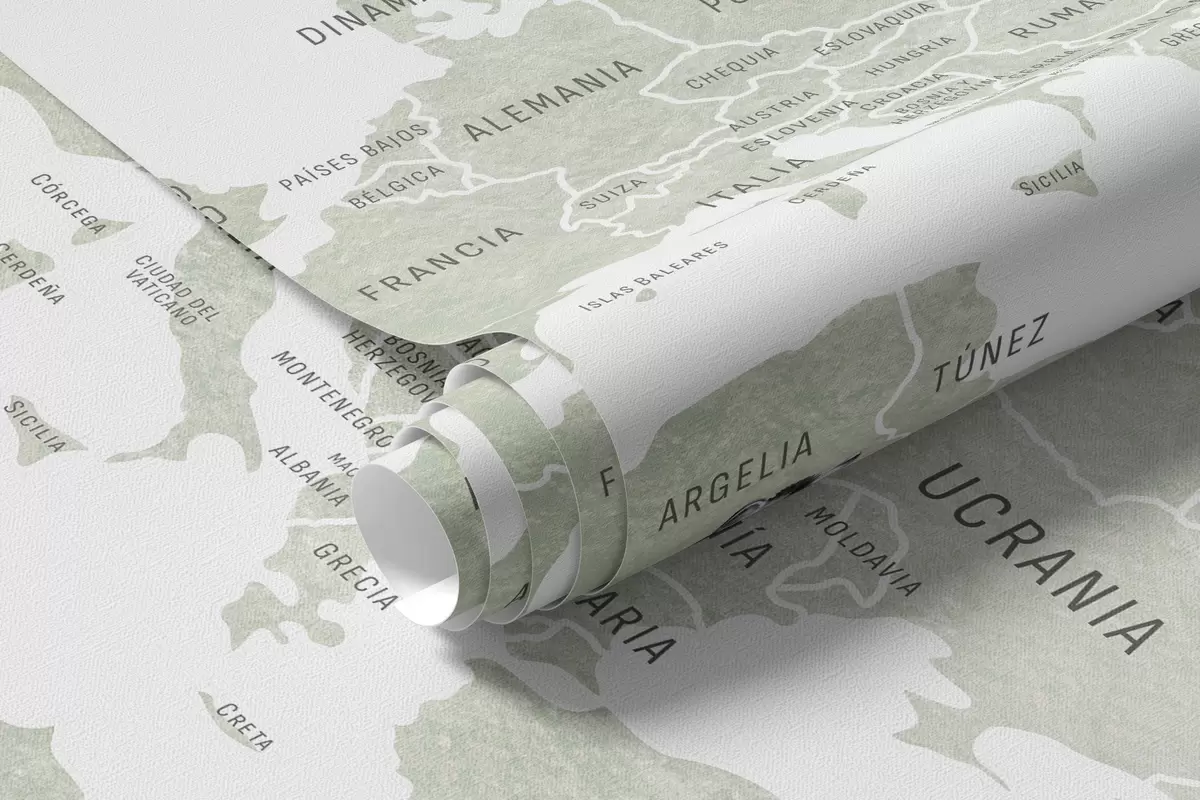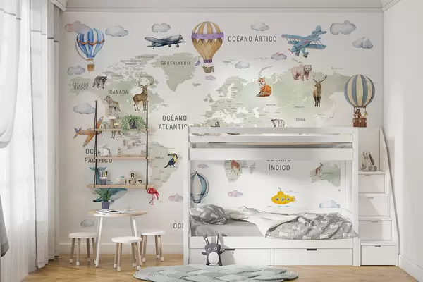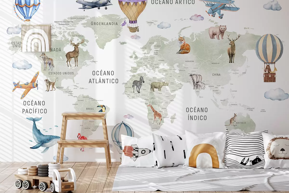 Carta da parati Mappa per bambini in stile acquerello con animali e mongolfiere. Lingua spagnola. Colore verde. nr. c00001es