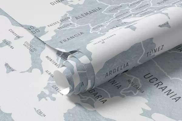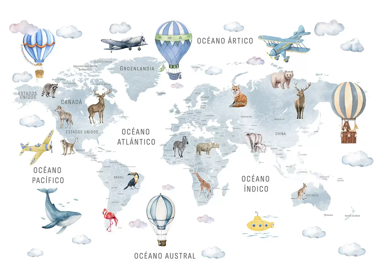 Carta da parati Mappa per bambini in stile acquerello con animali e mongolfiere. Lingua spagnola. Colore blu. nr. c00001esv1