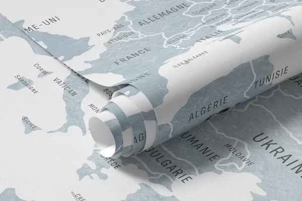 Carta da parati Mappa per bambini in stile acquerello con animali e mongolfiere. Lingua francese. Colore blu. nr. c00001frv1