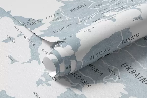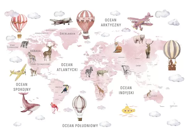 Carta da parati Mappa per bambini in stile acquerello con animali e mongolfiere. Lingua polacca. Colore blu. nr. c00001plv1