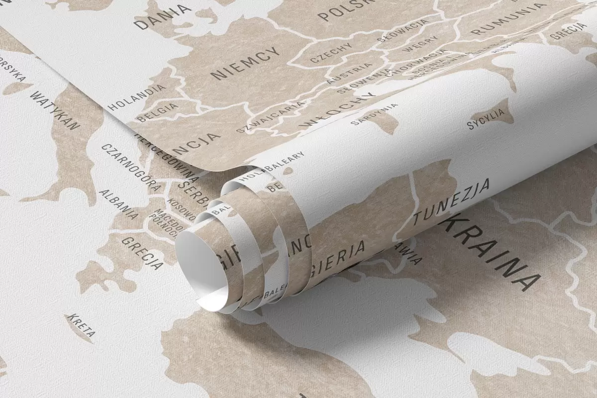 Carta da parati Mappa per bambini in stile acquerello con animali e mongolfiere. Lingua polacca. Colore beige. nr. c00001plv2