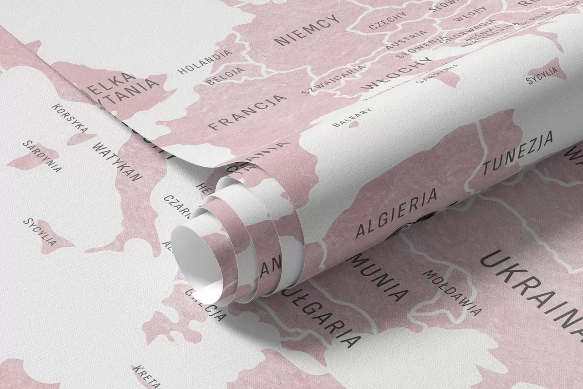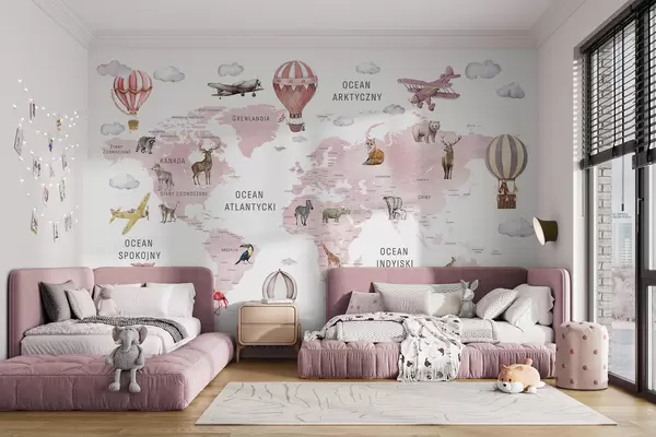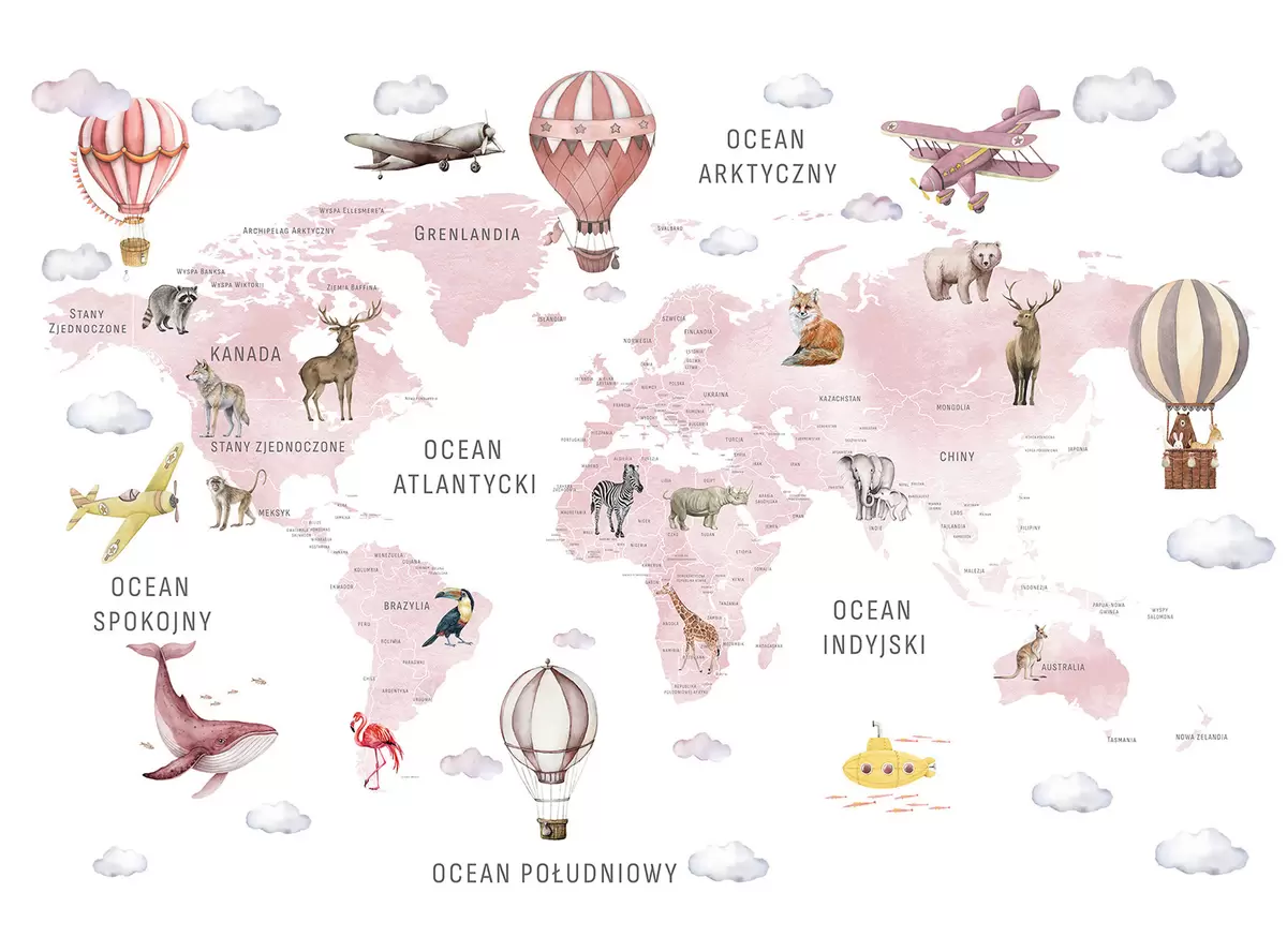 Carta da parati Mappa per bambini in stile acquerello con animali e mongolfiere. Lingua polacca. Colore rosa. nr. c00001plv3