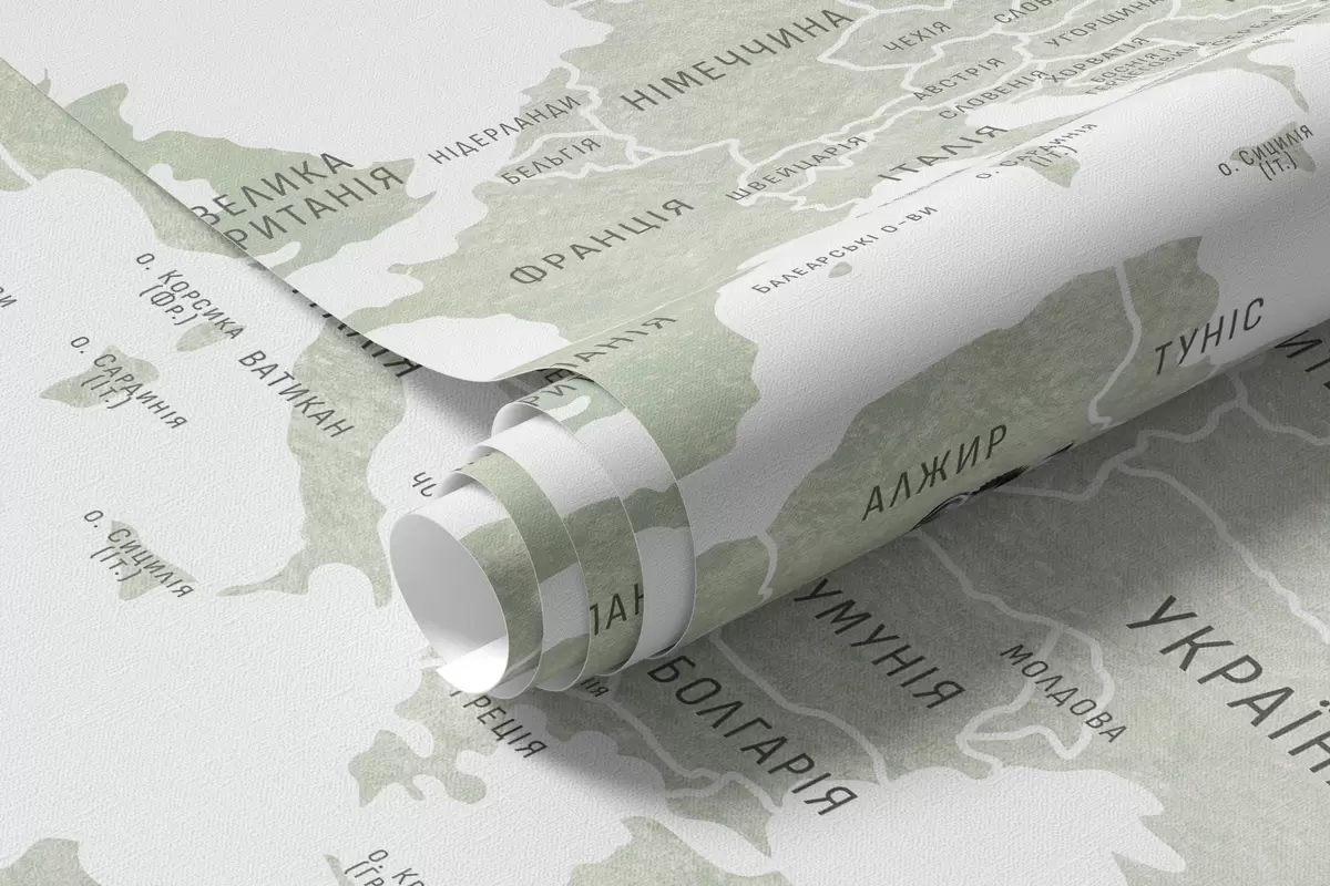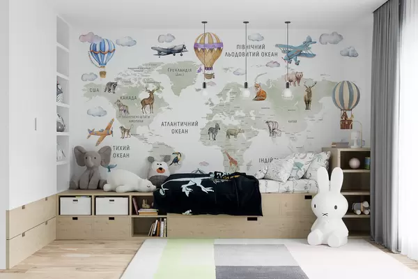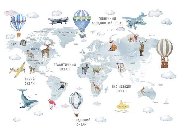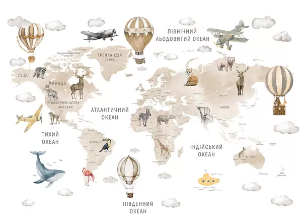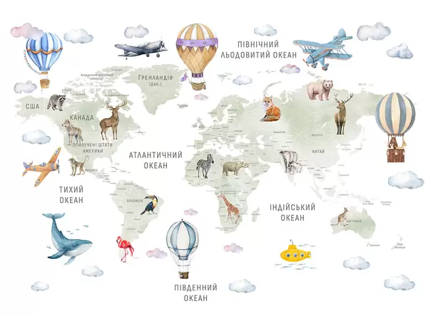 Carta da parati Mappa per bambini in stile acquerello con animali e mongolfiere. Lingua ucraina. Colore verde. nr. c00001uk