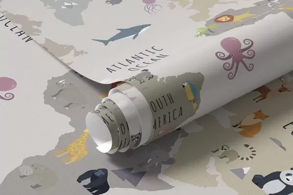 Carta da parati Mappa del mondo per bambini con animali e mongolfiere. Lingua inglese nr. c00002en