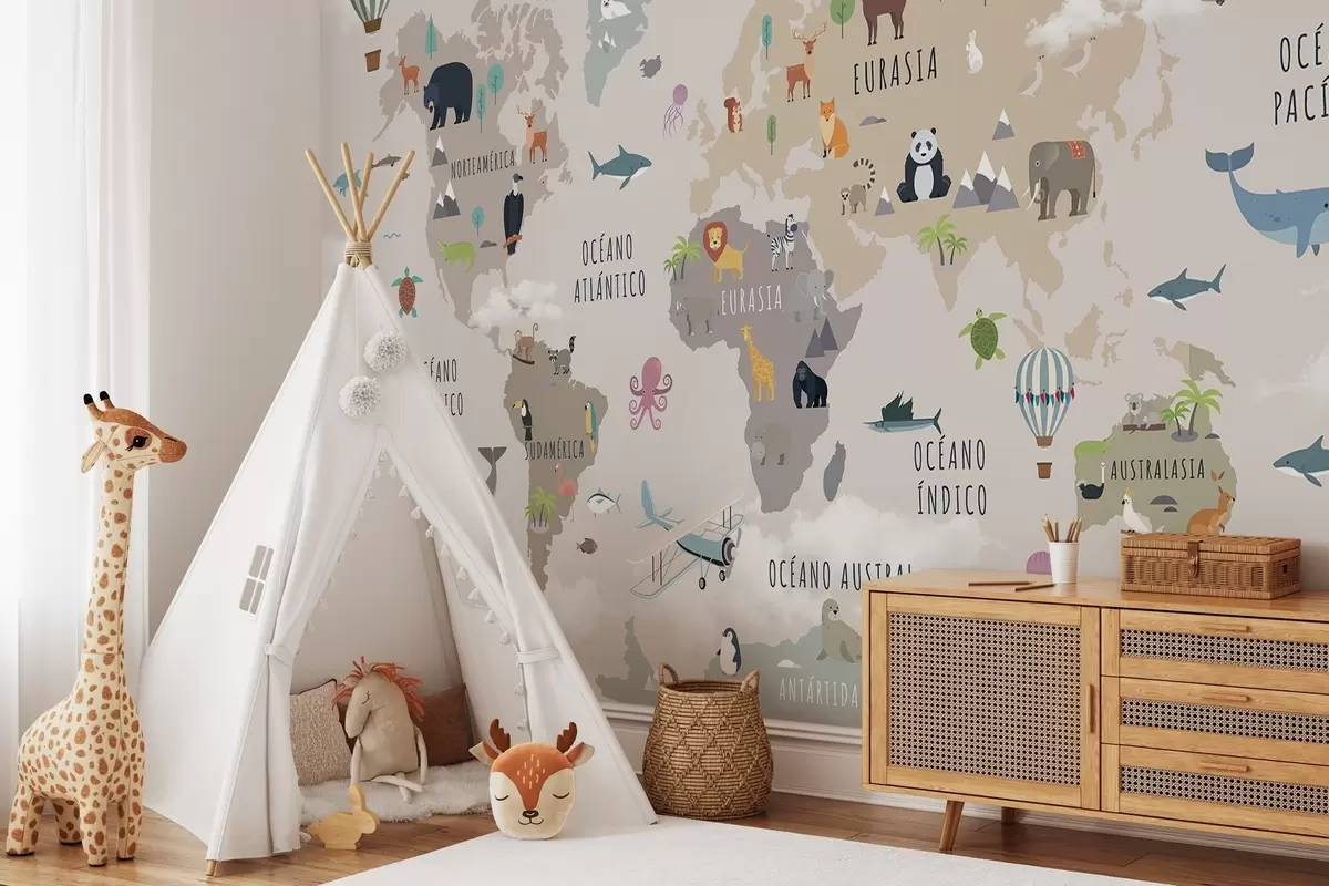 Carta da parati Mappa del mondo per bambini con animali e mongolfiere. Lingua spagnola. nr. c00002es