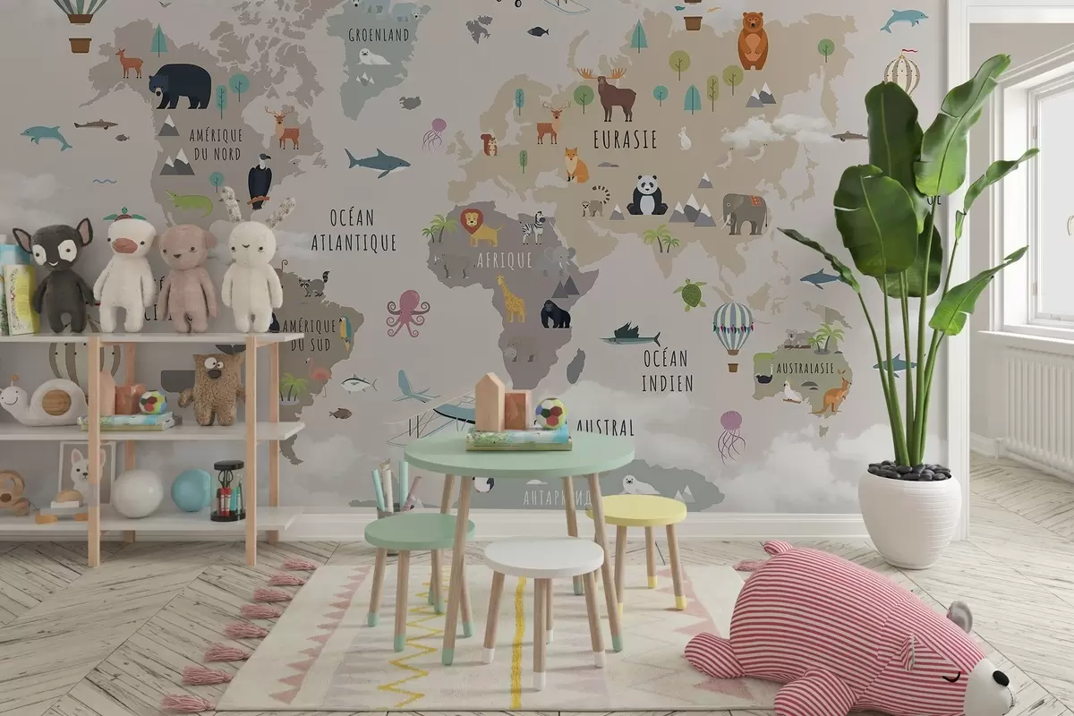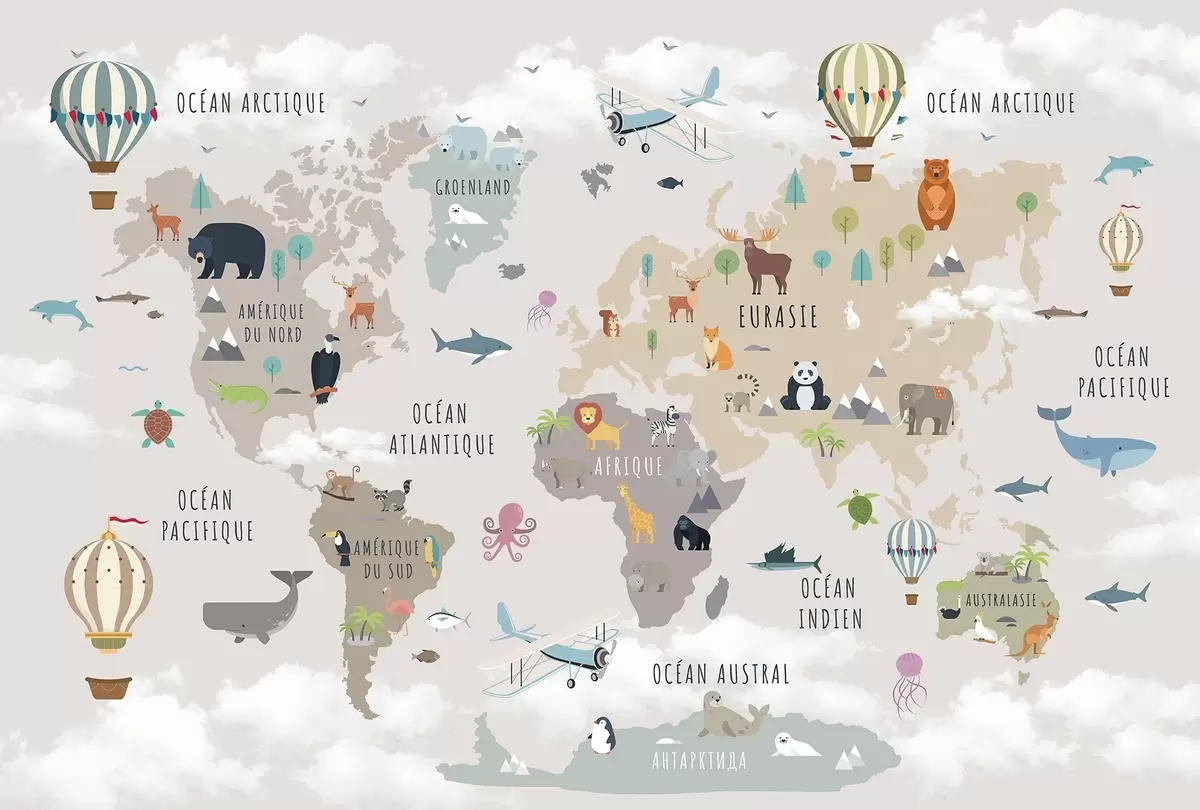 Carta da parati Mappa del mondo per bambini con animali e mongolfiere. Lingua francese nr. c00002fr