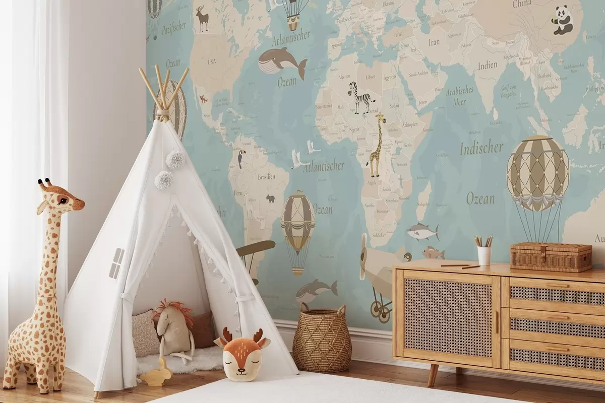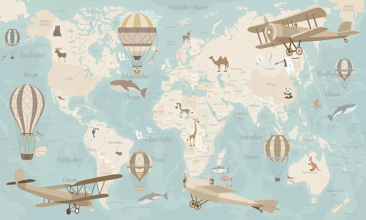 Carta da parati Mappa del mondo per bambini con animali, aeroplani e mongolfiere. Lingua tedesca. Colore blu nr. c00003dev1