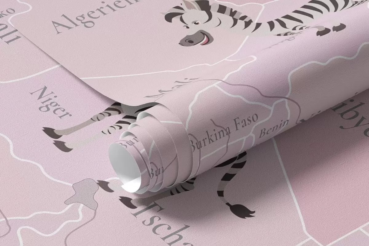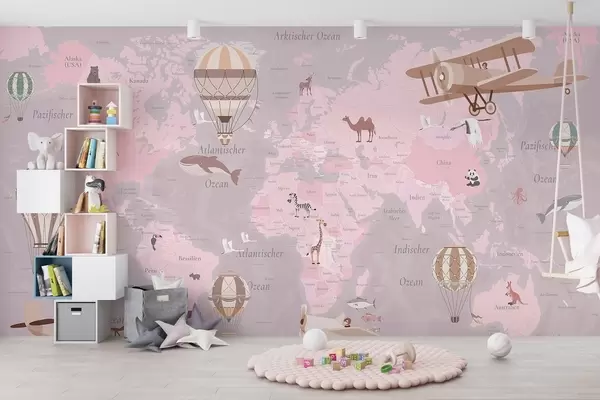 Carta da parati Mappa del mondo per bambini con animali, aeroplani e mongolfiere. Lingua tedesca. Colore rosa nr. c00003dev3