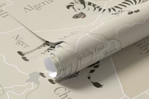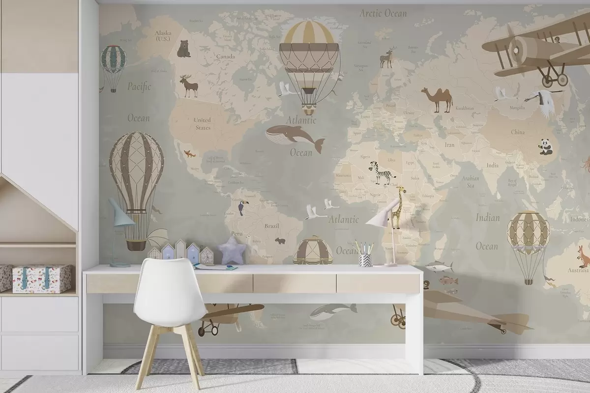 Carta da parati Mappa del mondo per bambini con animali, aeroplani e mongolfiere. Lingua inglese. Colore beige nr. c00003en