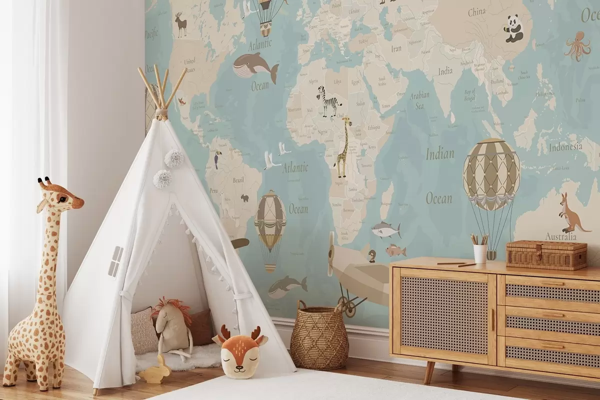 Carta da parati Mappa del mondo per bambini con animali, aeroplani e mongolfiere. Lingua inglese. Colore blu nr. c00003env1
