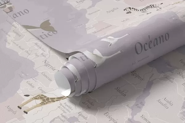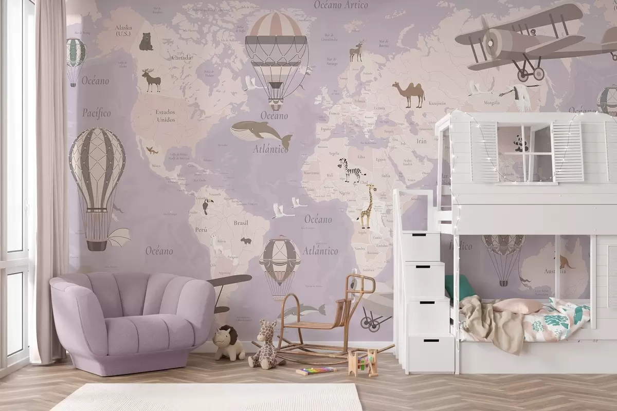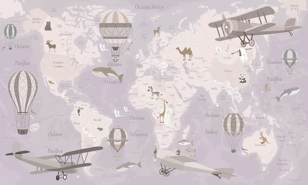 Carta da parati Mappa del mondo per bambini con animali, aeroplani e mongolfiere. Lingua spagnola. Colore viola nr. c00003esv4