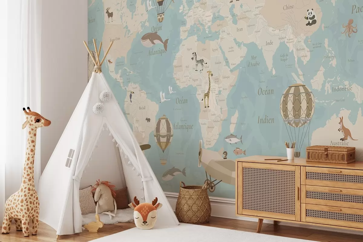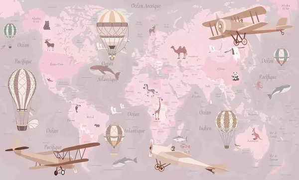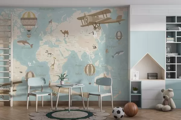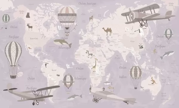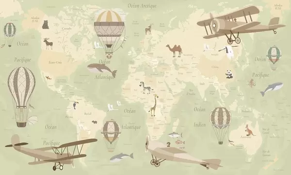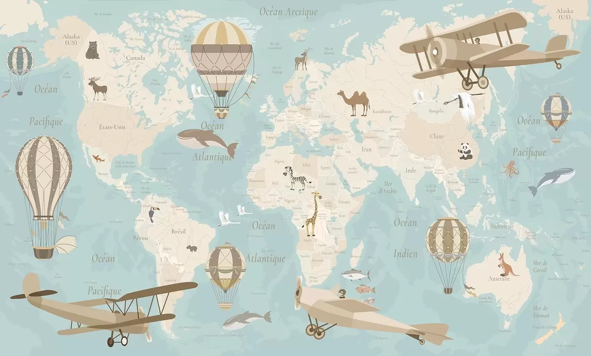 Carta da parati Mappa del mondo per bambini con animali, aeroplani e mongolfiere. Lingua francese. Colore blu nr. c00003frv1