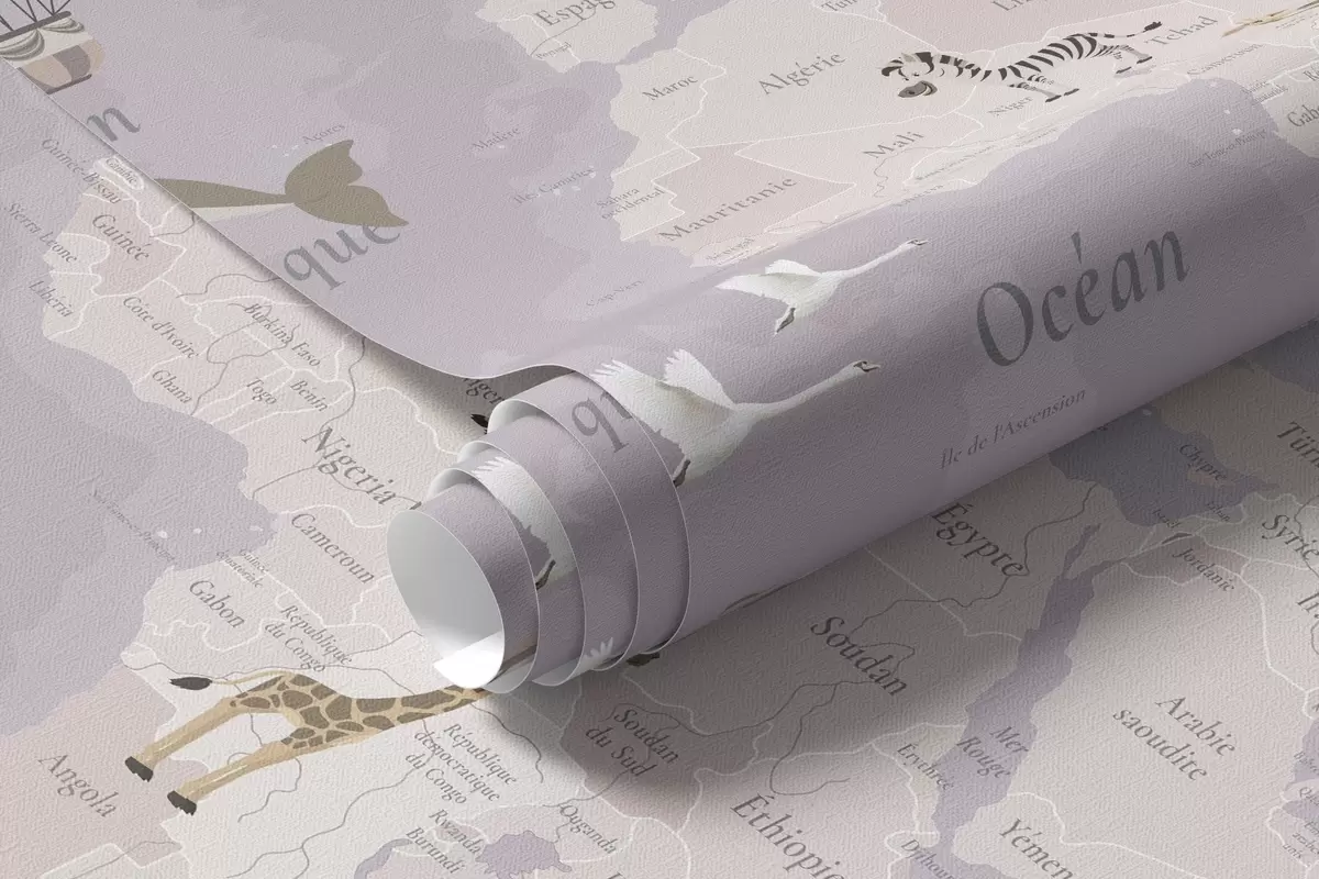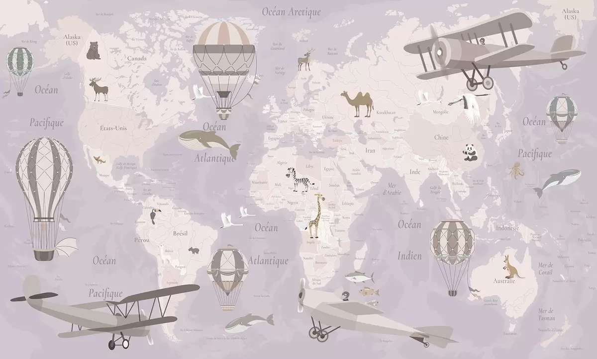 Carta da parati Mappa del mondo per bambini con animali, aeroplani e mongolfiere. Lingua francese. Colore viola nr. c00003frv4