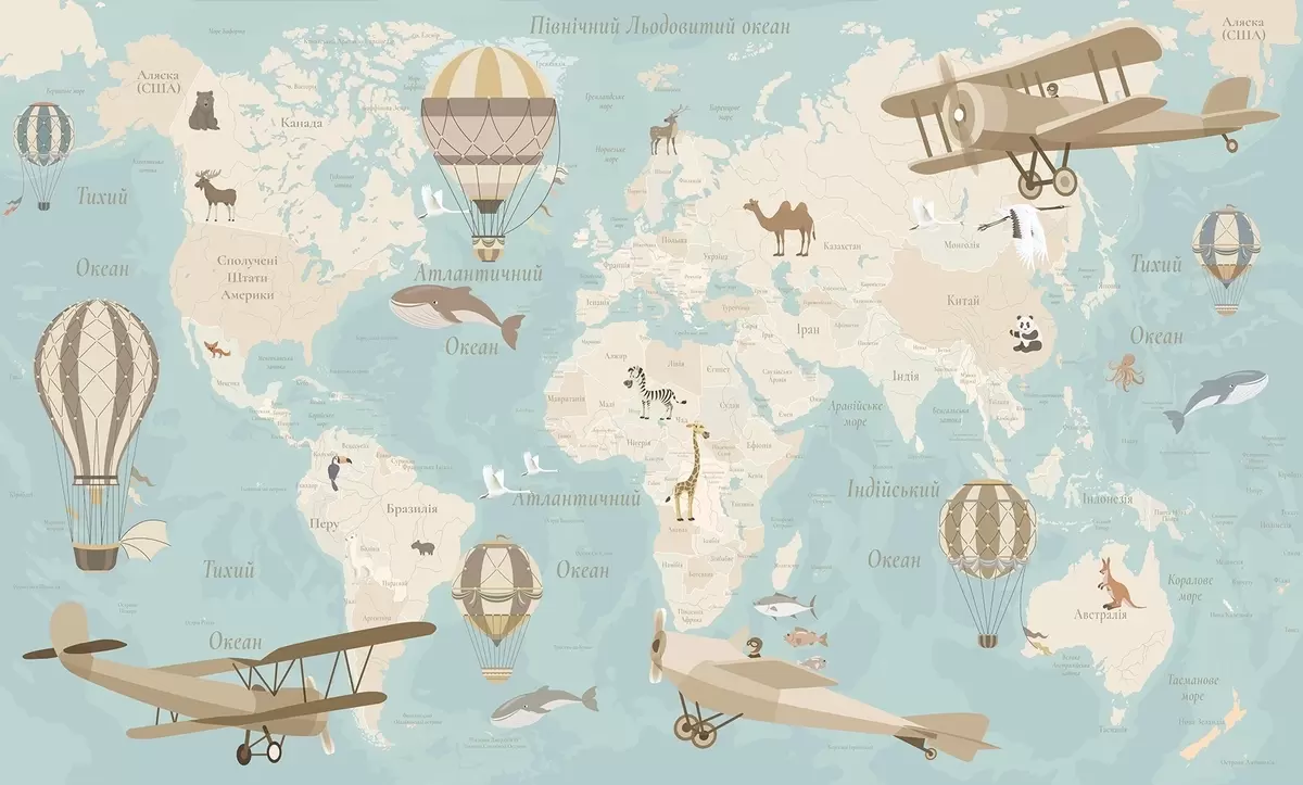 Carta da parati Mappa del mondo per bambini con animali, aeroplani e mongolfiere. Lingua ucraina. Colore blu nr. c00003ukv1