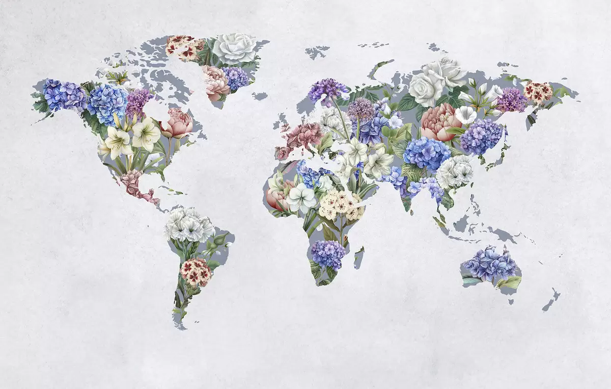 Carta da parati Una mappa del mondo colorata, realizzata con una varietà di fiori dai colori vivaci nr. c00006