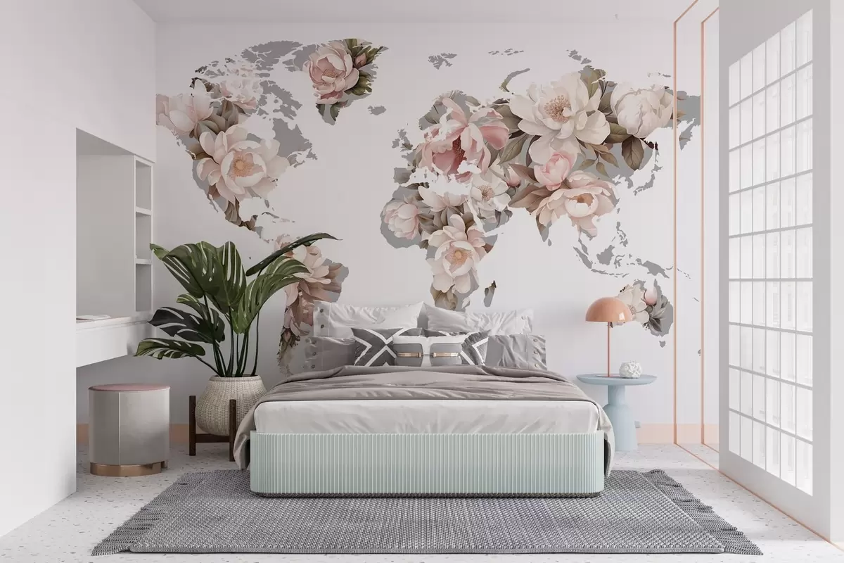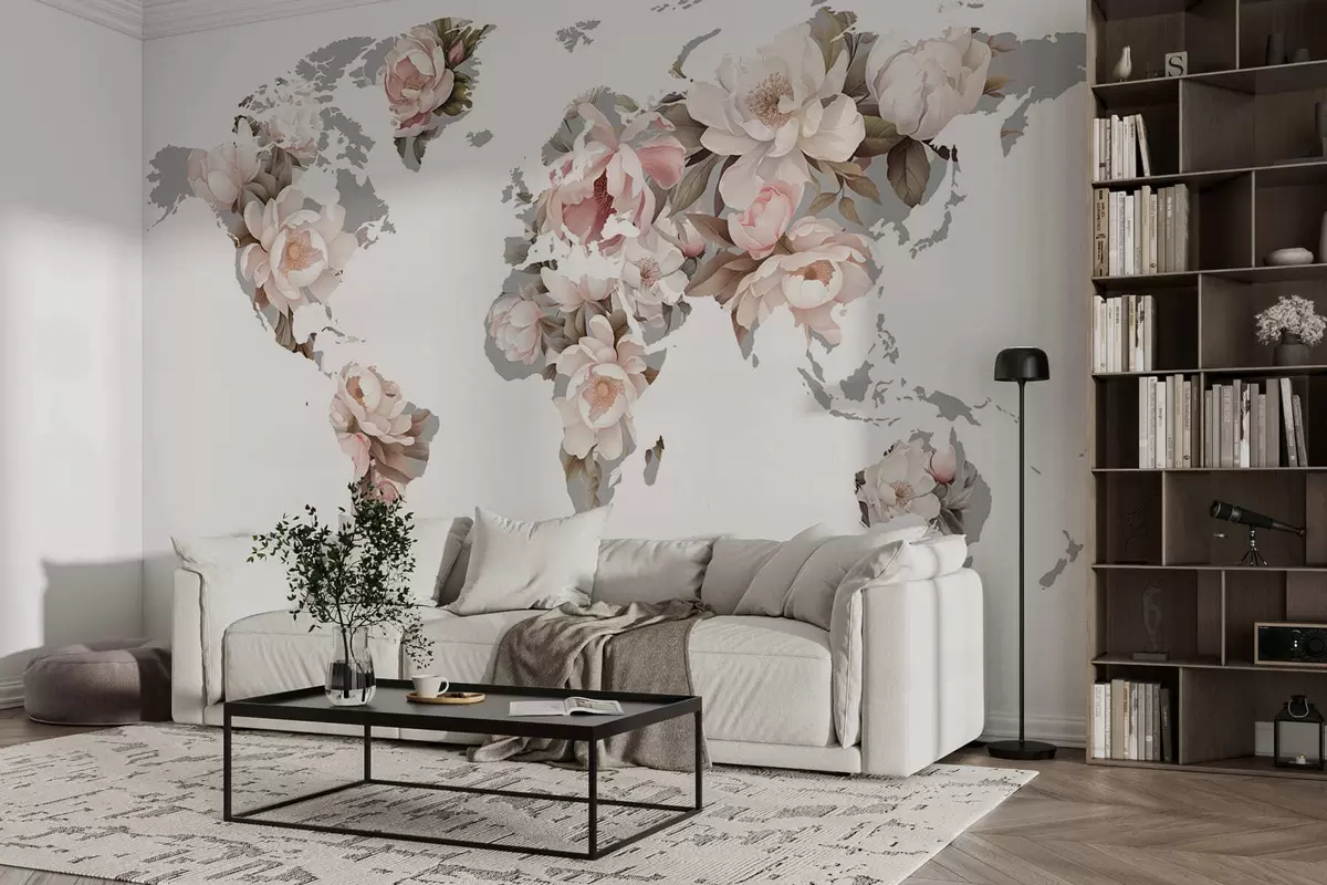 Carta da parati Una delicata mappa del mondo cremosa realizzata con fiori nr. c00008