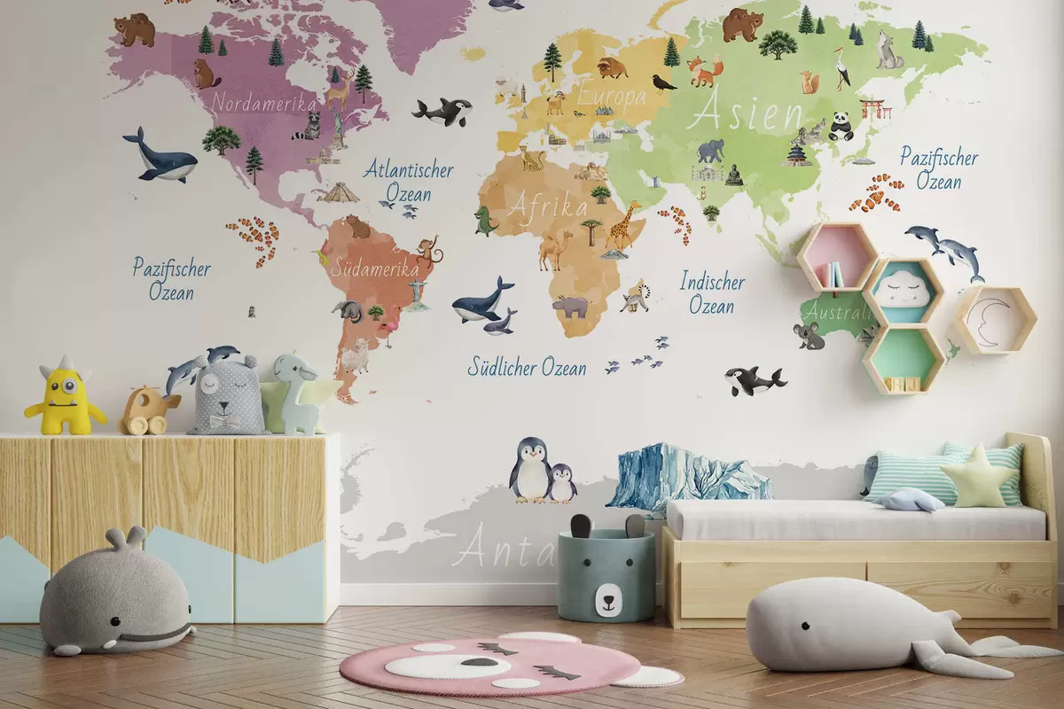 Carta da parati Una mappa a colori in stile acquerello che raffigura animali, piante ed edifici. Didascalie in tedesco nr. c00009de