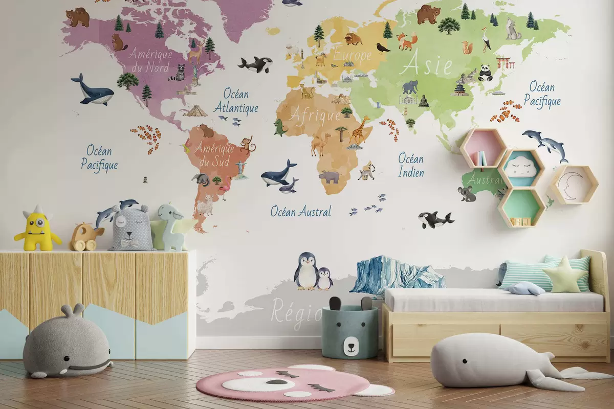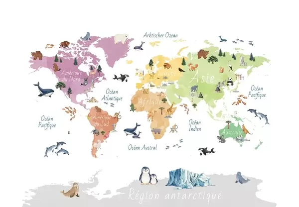 Carta da parati Una mappa a colori in stile acquerello che raffigura animali, piante ed edifici. Didascalie in francese nr. c00009fr