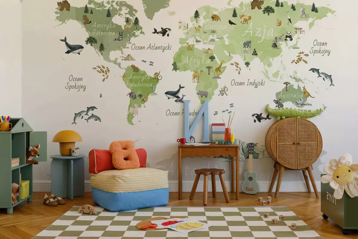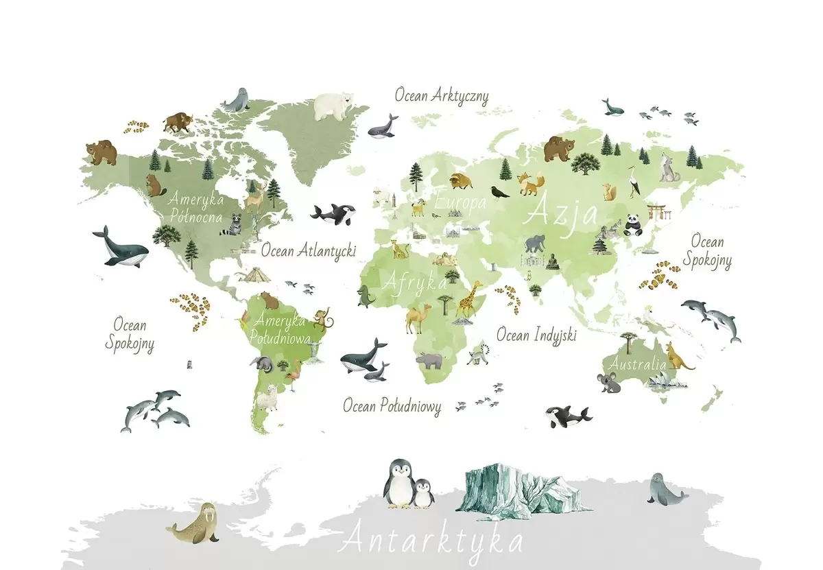 Carta da parati Una mappa in stile acquerello che raffigura animali, piante ed edifici. Didascalie in polacco nr. c00009plv2