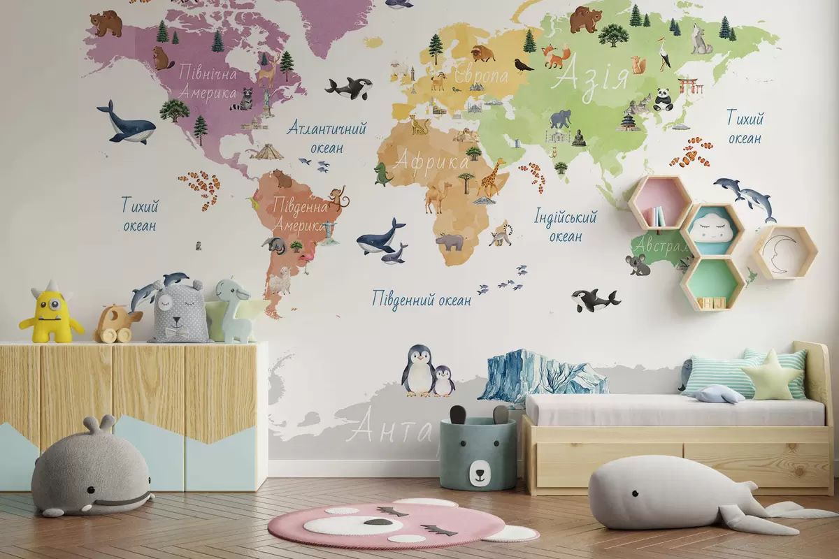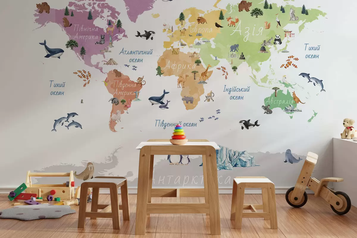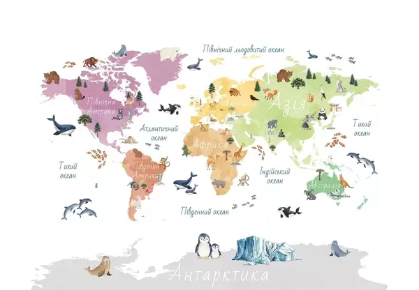 Carta da parati Una mappa a colori in stile acquerello che raffigura animali, piante ed edifici. Didascalie in ucraino nr. c00009uk