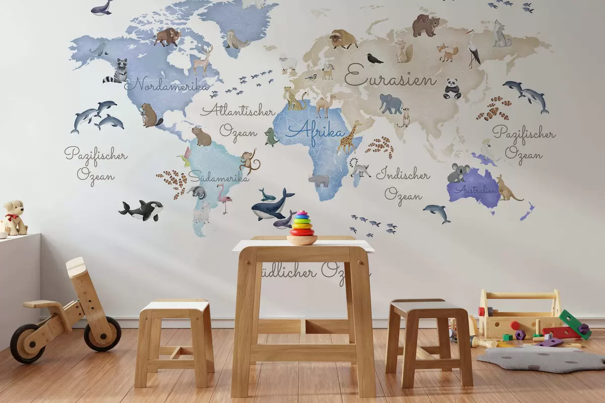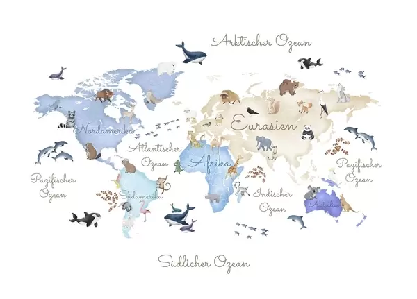 Carta da parati Una mappa blu in stile acquerello con animali. Etichette in tedesco nr. c00012dev1