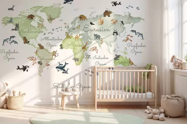 Carta da parati Una mappa verde in stile acquerello con animali. Dettagli in tedesco nr. c00012dev2