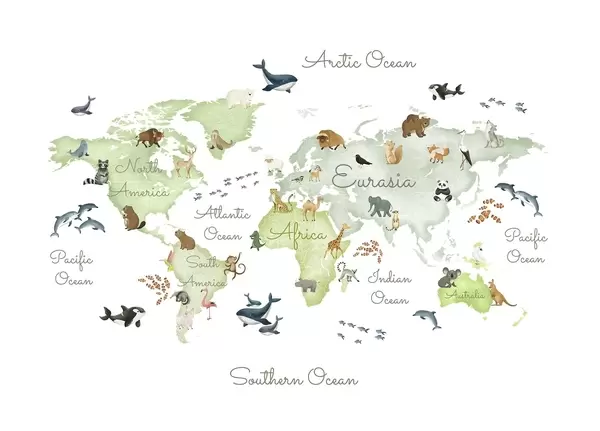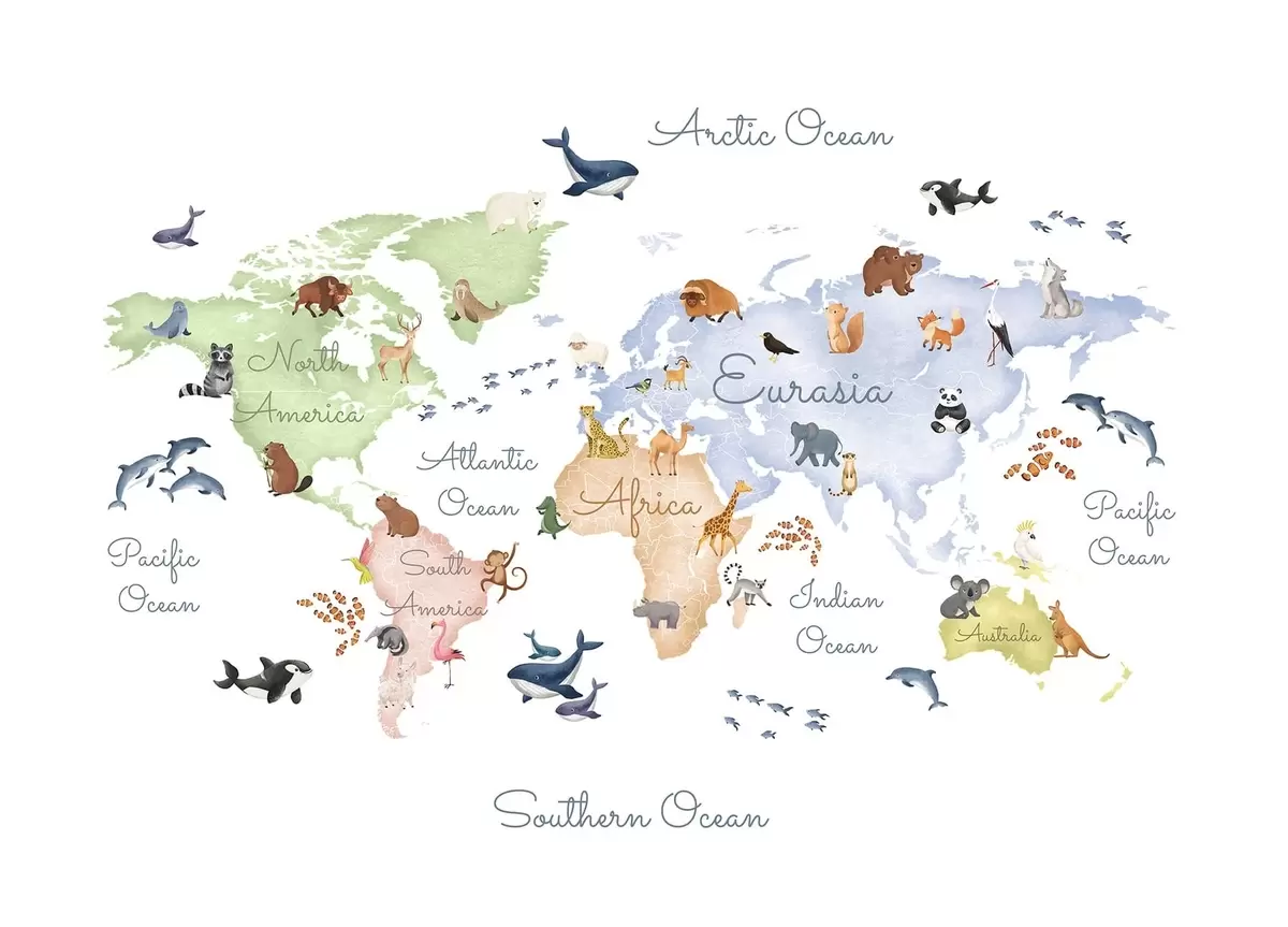 Carta da parati Una mappa a colori in stile acquerello con immagini di animali. Didascalie in inglese nr. c00012en