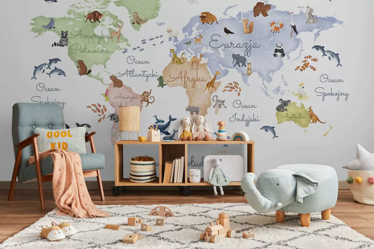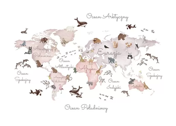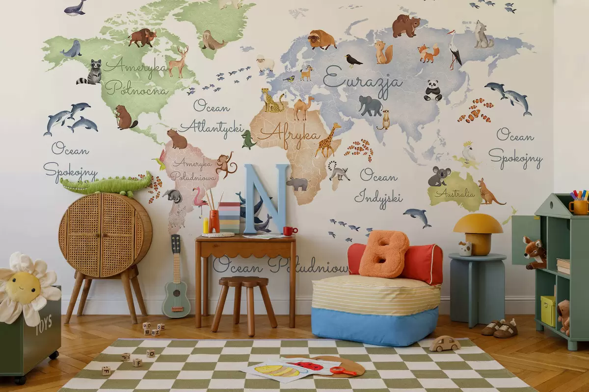 Carta da parati Una mappa a colori in stile acquerello con immagini di animali. Didascalie in polacco nr. c00012pl