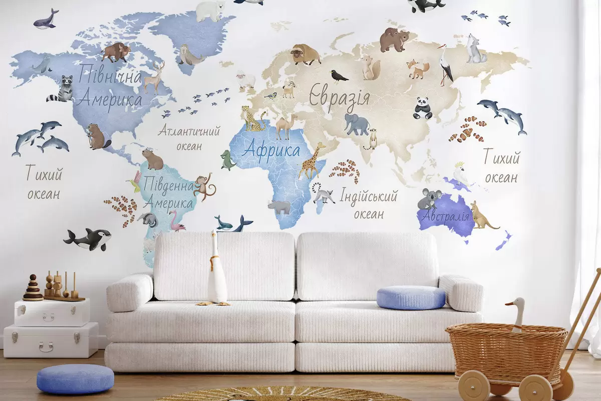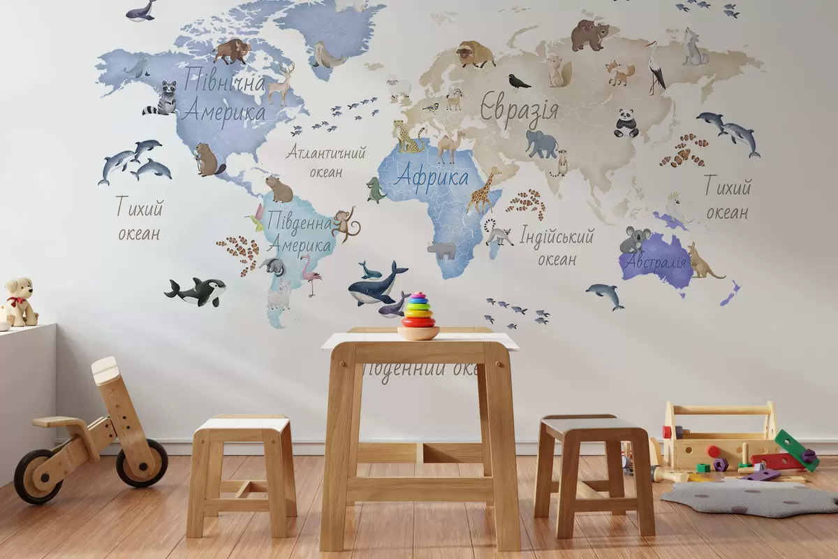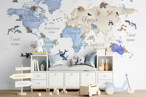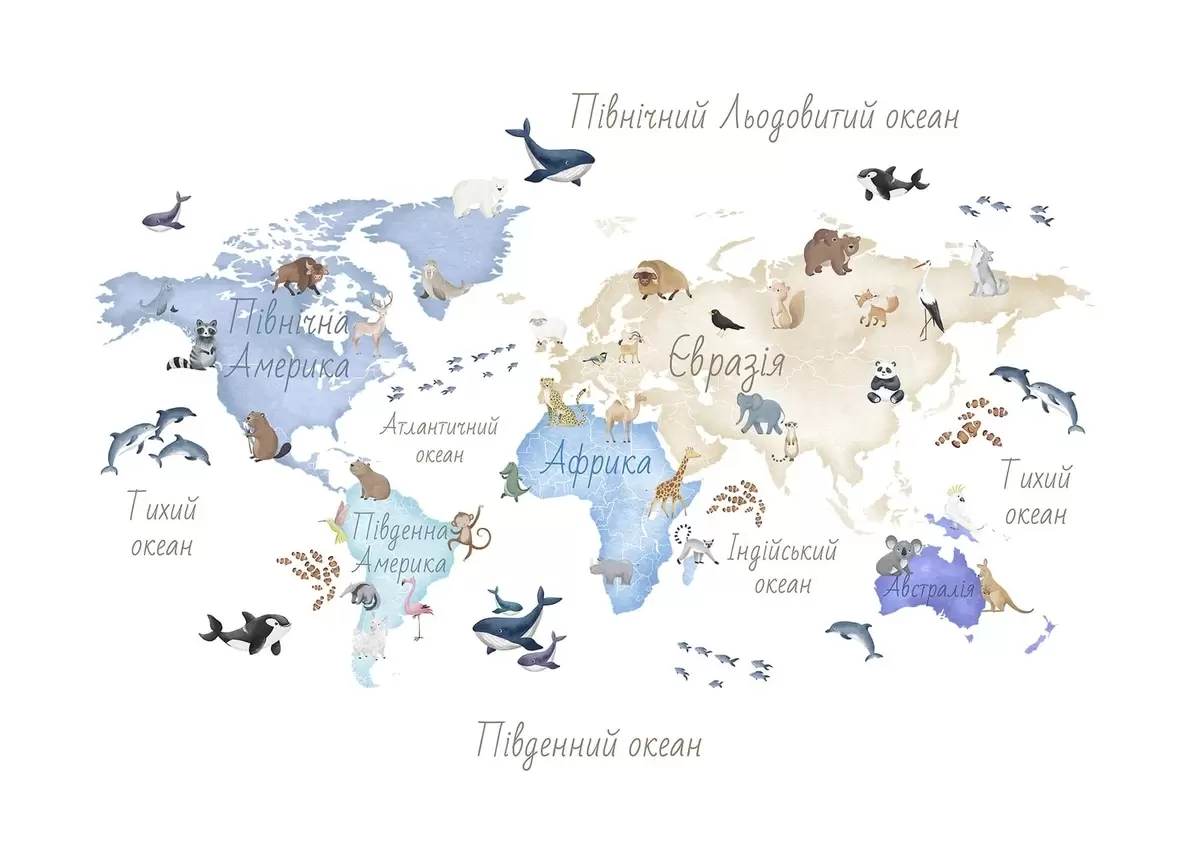 Carta da parati Una mappa blu in stile acquerello con immagini di animali. Dettagli in ucraino nr. c00012ukv1