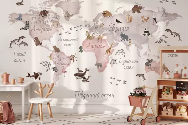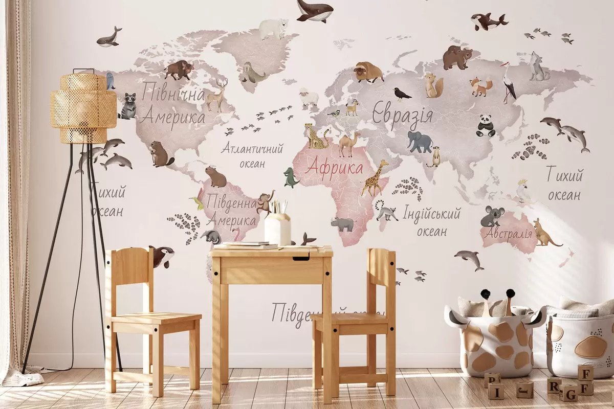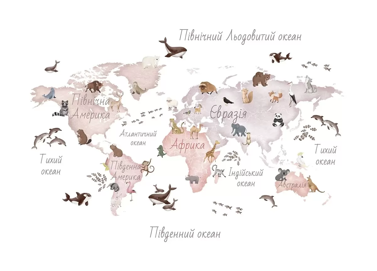 Carta da parati Una mappa in stile acquerello dai toni del beige con immagini di animali. Etichette in ucraino nr. c00012ukv3