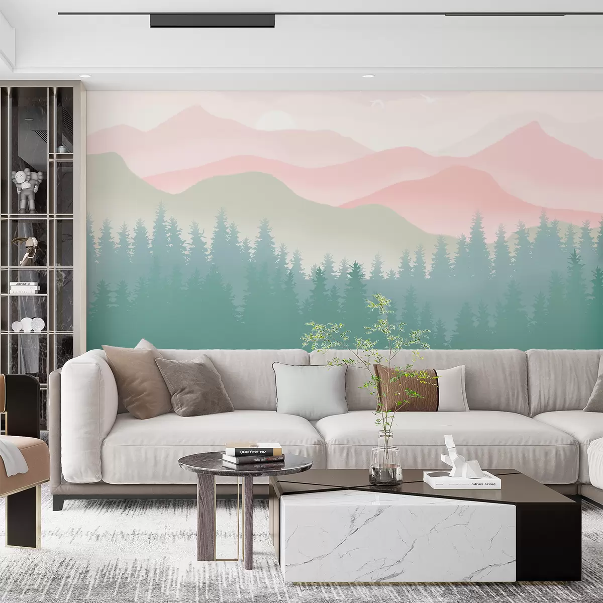 Carta da parati Montagne nebbiose con pineta, colori naturali tenui, rosa e verde nr. u98774