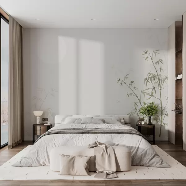 Carta da parati Stile minimalista Japandi pianta di bambù e sole Chinoiserie colore verde nr. w00547