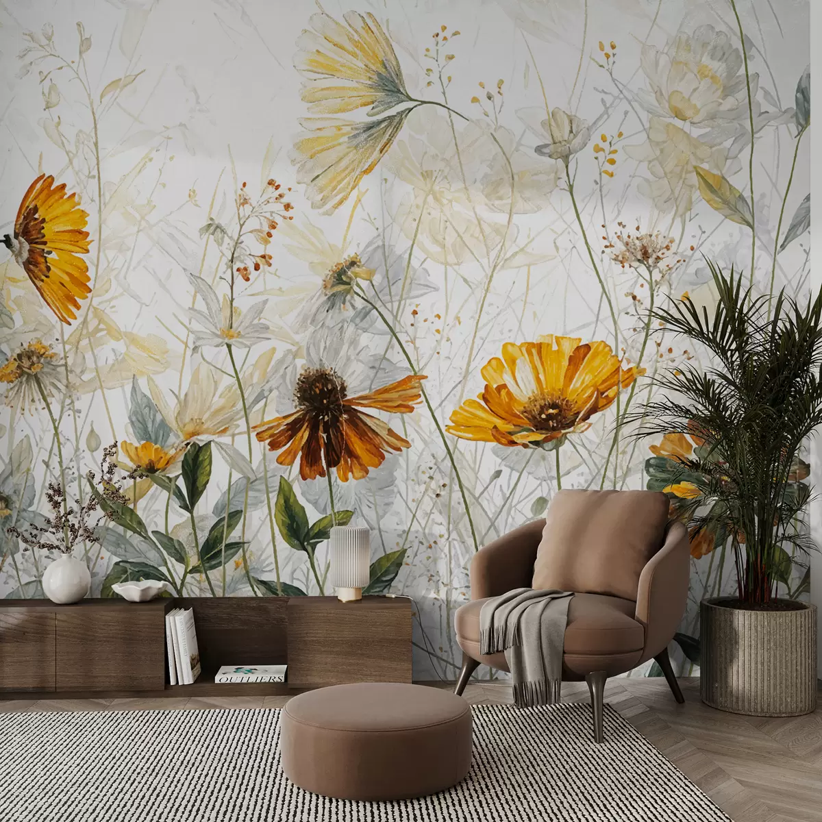 Carta da parati Un campo di fiori vivaci su uno sfondo morbido e nebbioso con delicati fiori bianchi ed erba sottile nr. w00708