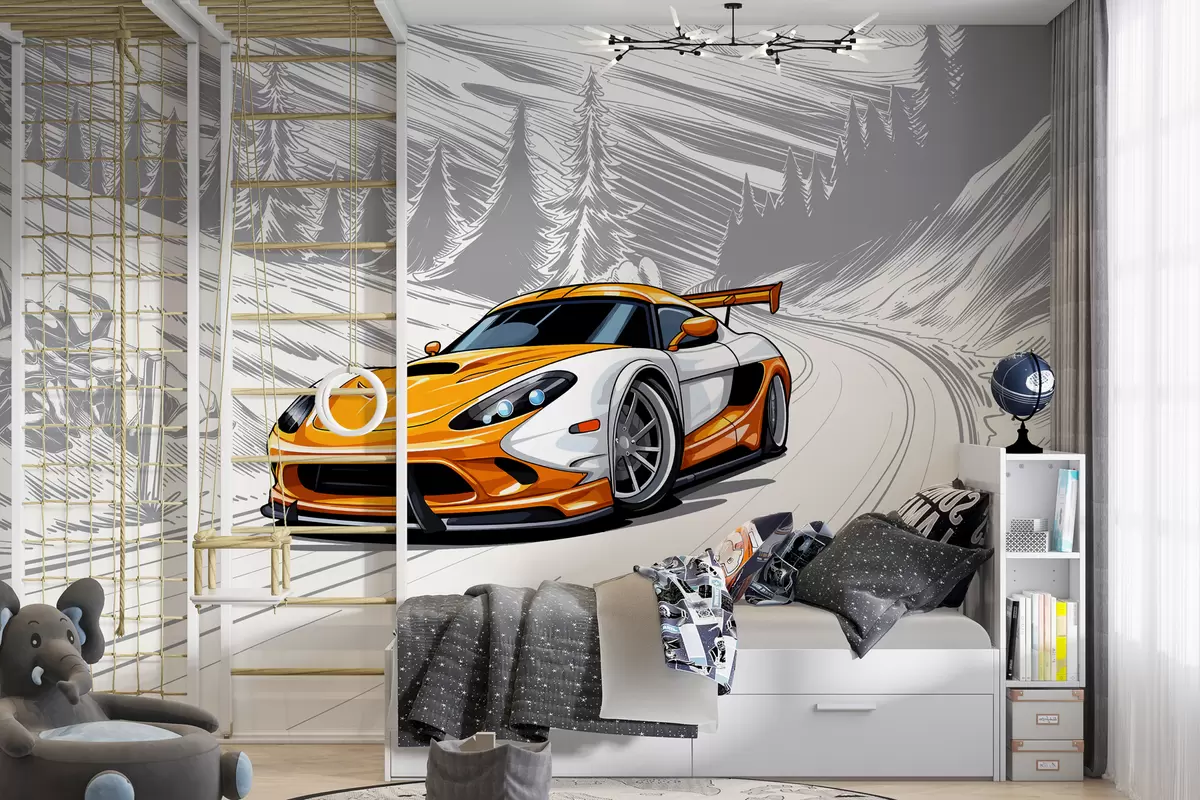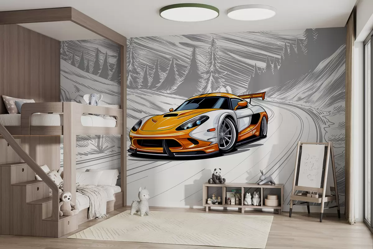 Carta da parati Un'auto sportiva arancione su uno sfondo grigio di strada abbozzata tra montagne e abeti. Per decorare la stanza di un ragazzo nr. w00954