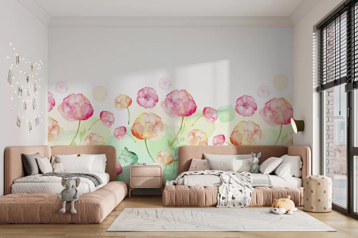 Carta da parati tulipani rosso-arancio e rosa in tecnica acquerello su sfondo bianco con macchie verdi nr. w01028