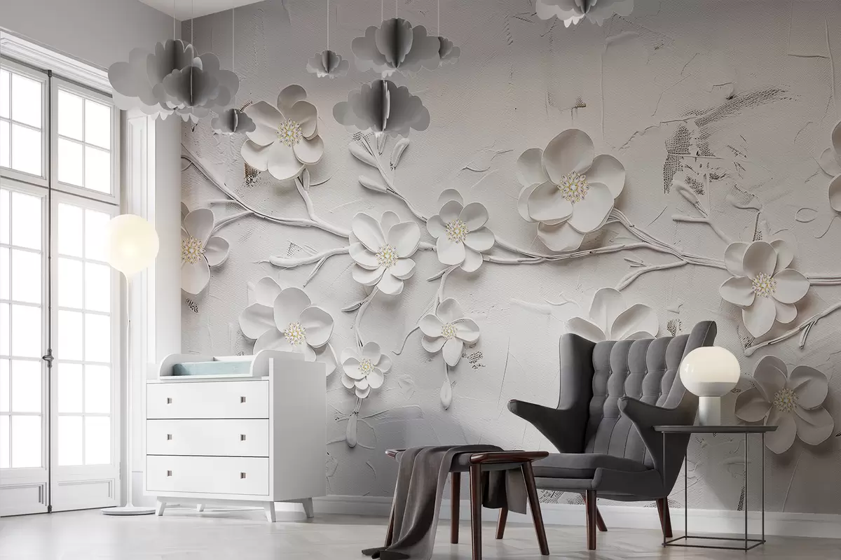 Carta da parati Sfondo bianco strutturato con fiori bianchi 3D in piena fioritura, collegati da rami, minimalista ed elegante nr. w01226