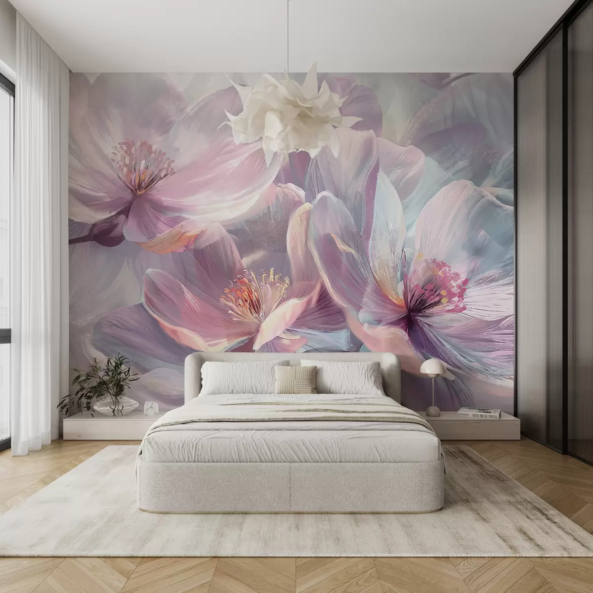 Carta da parati Delicati fiori rosa chiaro e bianchi pastello trasparenti al neon con sfondo morbido e sfocato nr. w01307