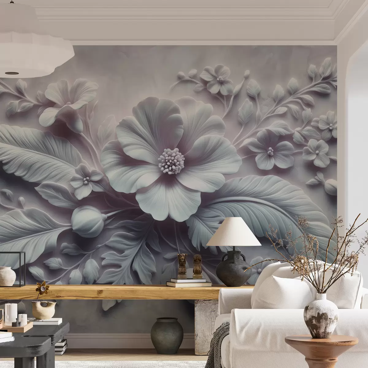 Carta da parati Arte murale in rilievo 3D raffigurante piume e fiori, con un grande papavero nei colori azzurro chiaro nr. w01340v2