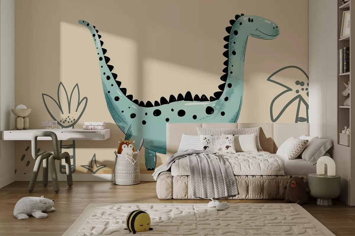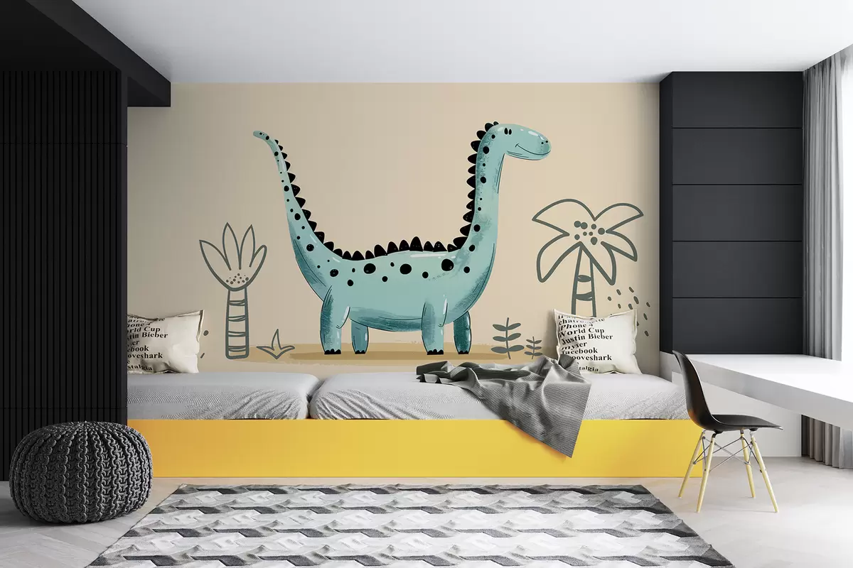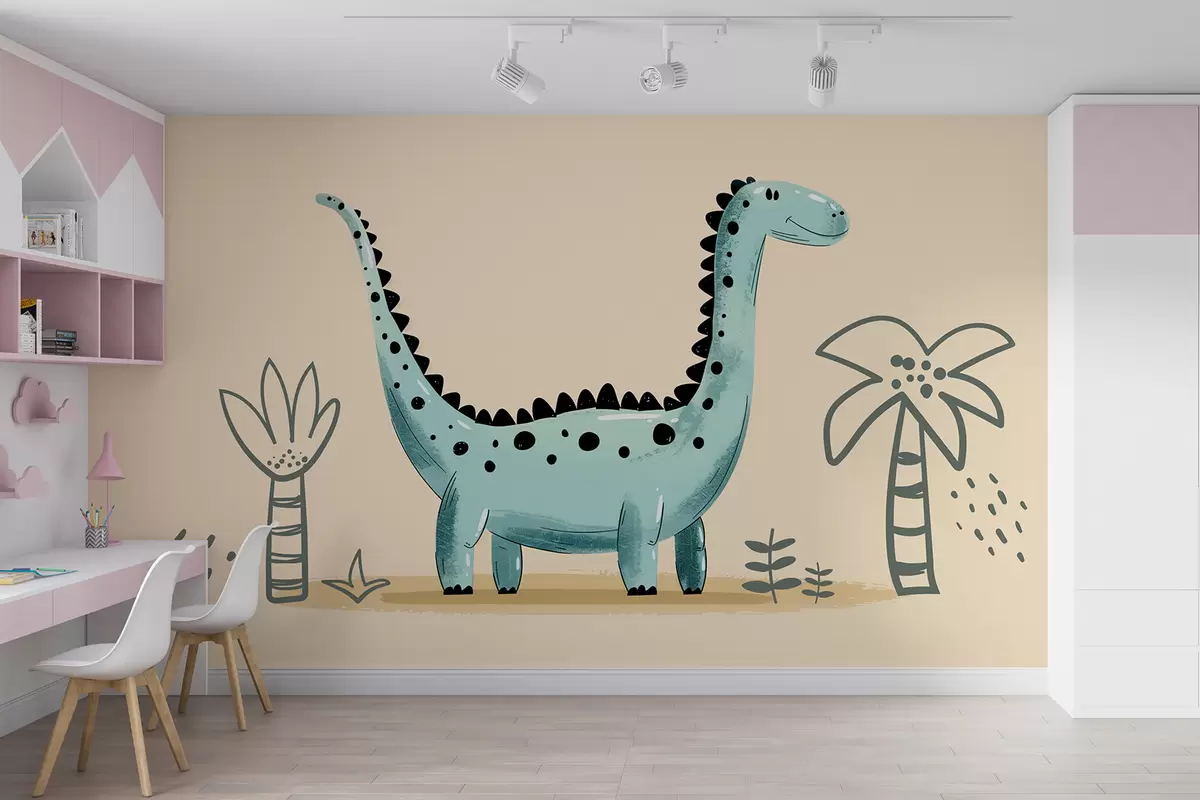 Carta da parati Simpatico dinosauro su sfondo beige con palme nr. w01357v1