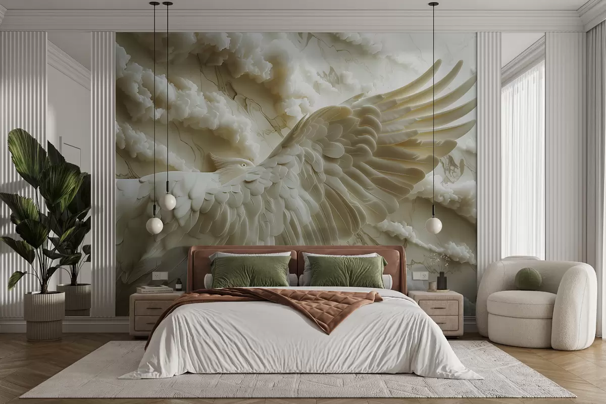 Carta da parati Aquila bianca volante in 3D su uno sfondo di nuvole e marmo nr. w01476