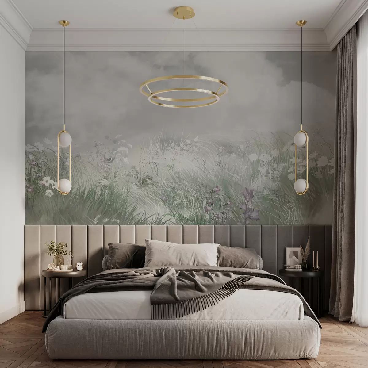 Carta da parati Fiori ed erbe selvatiche con cielo grigio e nuvole nr. w01624v3