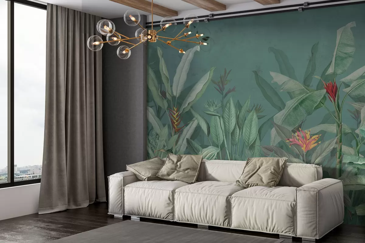 Carta da parati Foglie e fiori tropicali su sfondo verde nr. w01834v2