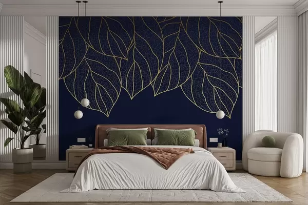 Carta da parati Sagome di carta da parati minimalista di grandi foglie gialle con venature su sfondo blu nr. w01960v3