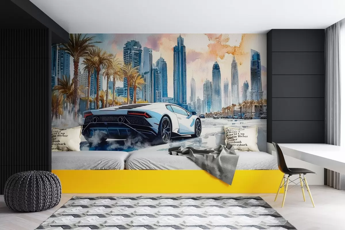 Carta da parati Un'auto sportiva moderna bianca che sfreccia sullo sfondo di palme e grattacieli in tecnica libera ad acquerello nr. w01963