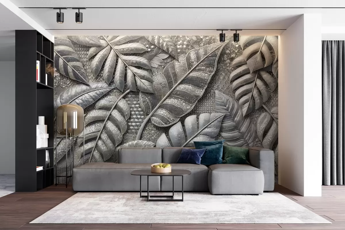 Carta da parati Grandi foglie tropicali in delicate tonalità argentate, in uno stile di mosaico strutturato nr. w02135